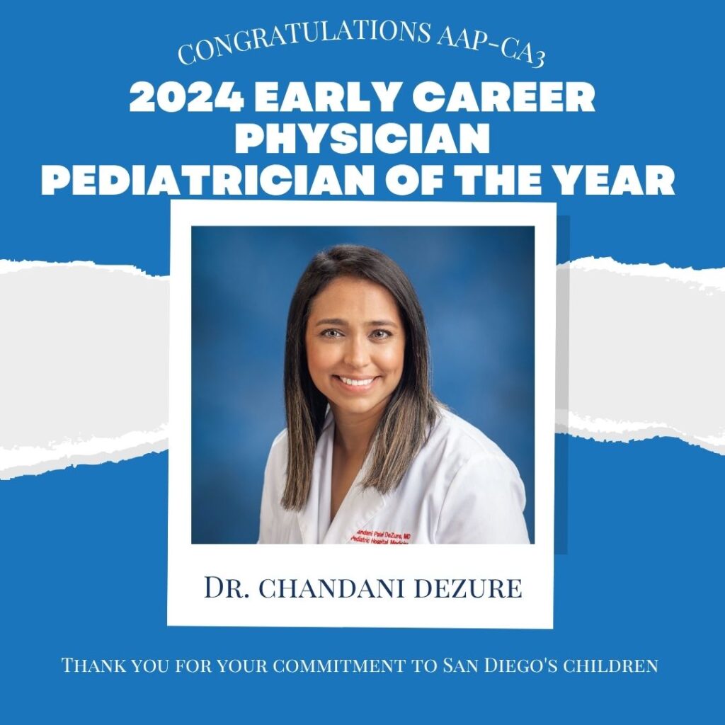 Special Achievement Award for 2023 is presented with sincere appreciation to Dr. Chandani Patel DeZure in appreciation of her role as the Chapter Equity, Diversity, and Inclusion (DEI) Champion for the Chapter. Her leadership brings positive change through conducting trainings and education to reduce health disparities in pediatric care. For her outstanding contributions to the improvement of health and well-being of children, and for her commitment, dedication and advocacy to pediatrics, teens, children, and families.