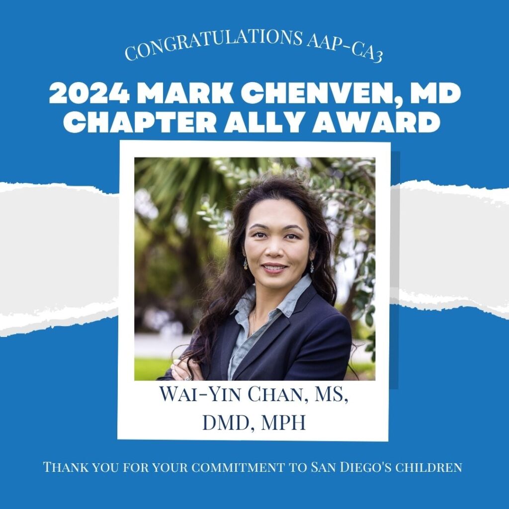 For her steadfast leadership and collaboration with our local Chapter on the San Diego County Oral Health Coalition Medical-Dental Integration Workgroup. For her outstanding dedication and contributions to the improvement of pediatric oral health in San Diego County and beyond.